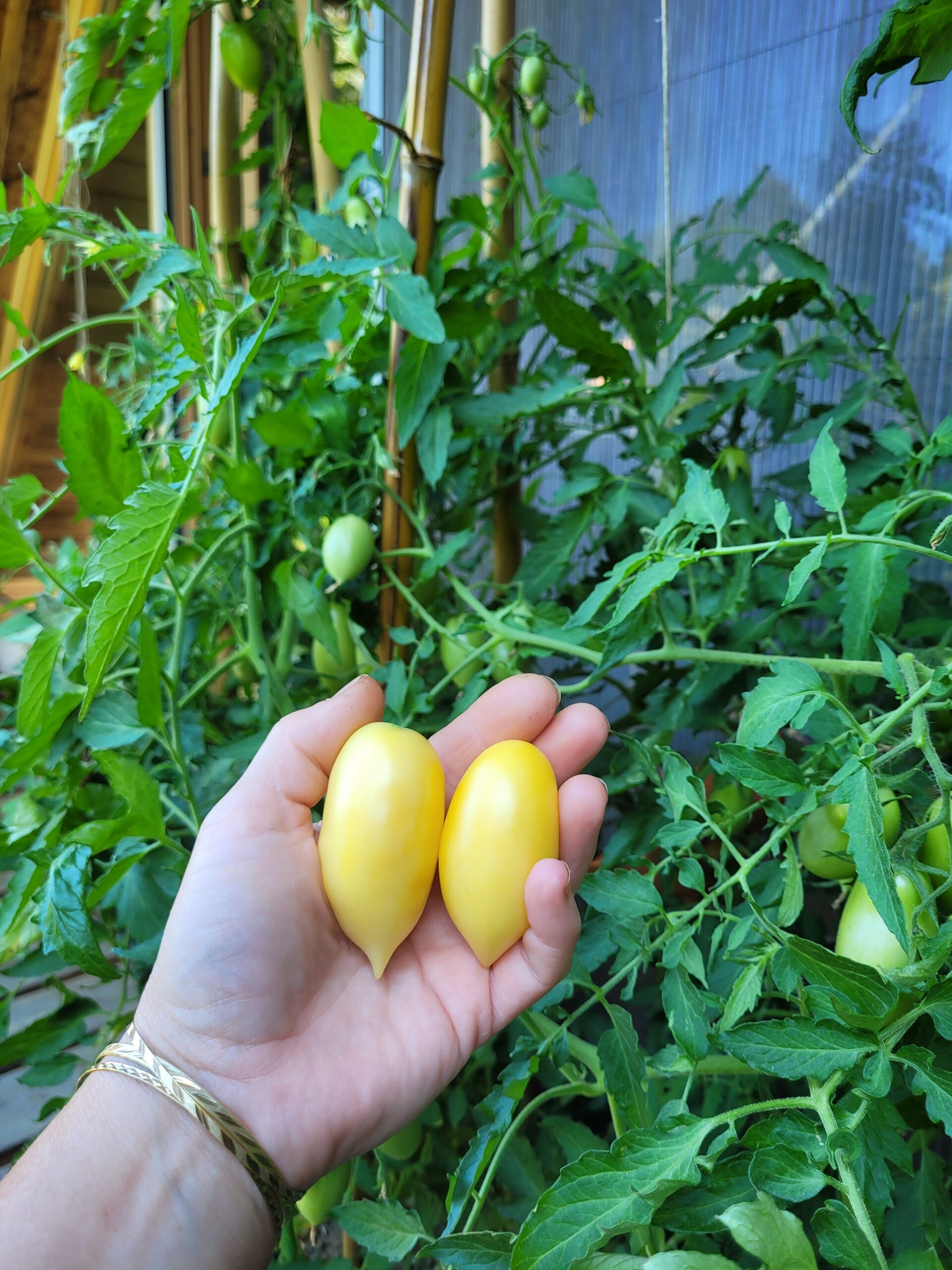 Die Cream Sausage ist eine tolle Sorte durch und durch! Erstens schmeckt sie hervorragend meiner Meinung nach. Sie ist mild, sehr süß und hat wenig bis keine Säure. Die Früchte sind dekorativ hellgelb, länglich walzenförmig , ca. 10cm, mit betonter Spitze. Konsistenz ist ebenfalls ausgewogen fest/saftig bzw. wird mehlig bei Überreife. Sie tragen wirklich reichlich, obwohl sie niedrigwachsende Buschtomaten sind. Relativ frühreifend.